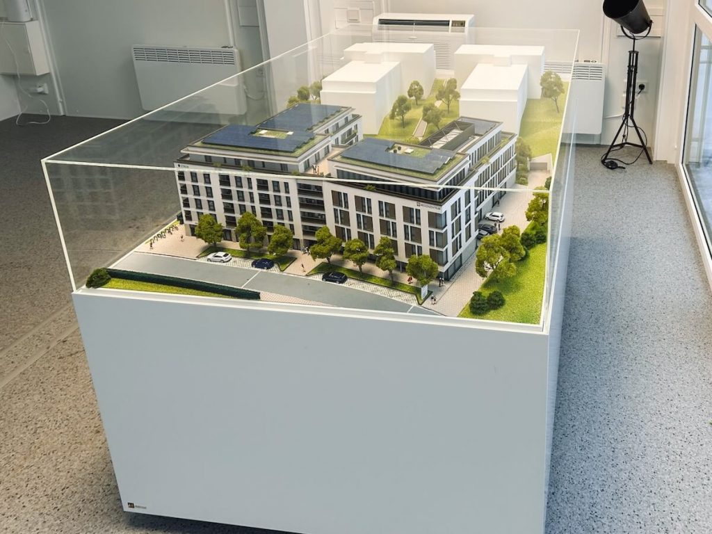 • Ein Modell des Gesamtprojekts wurde vom Modellbauer erstellt und kann im Vertriebscontainer vor Ort besichtigt werden. Das Modell zeigt den ersten Bauabschnitt – die weiteren zwei Gebäude sind als Folgeabschnitte dargestellt.